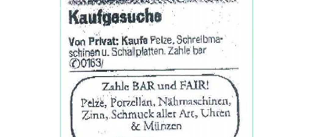Betrüger geben Kleinanzeigen auf: Suche Münzen, Schmuck, Uhren, Pelze usw. Auffällig sind die Anzeigen, weil die Artikel nicht zusammenpassen (keine Sammler oder Händler), sondern eigentlich eine Aufzählung mit dem Ziel, dass von den Sachen jeder irgendwas zu Hause rumliegen hat.